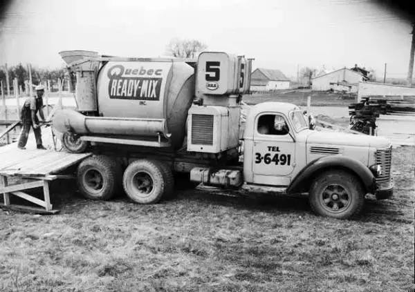 说完生产混凝土的设备,我们来看一下运输混凝土的搅拌车,整体的形状个结构与现在的都差不多,在当时,一台车也就能装个1-2方的混凝土左右,毕竟当时的技术在哪,汽车底盘也不可能承受更大的重量。
