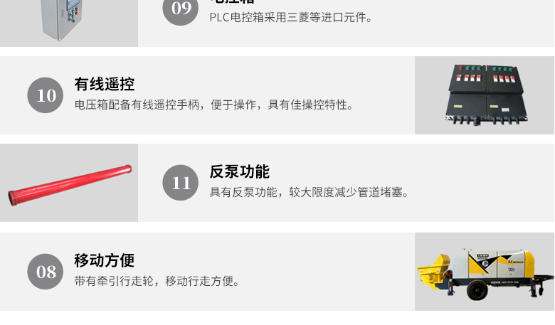 简 介:1、采用先进S管阀换向,出口压力高,能满足细石混凝土高层和远距离输送 2、主油泵采用优质恒功率变量柱赛泵,系统压力高,效能高,运行平衡。搅拌装置驱动采用低速大扭矩油压马达。具有反泵功能,大限度减少管道堵塞。